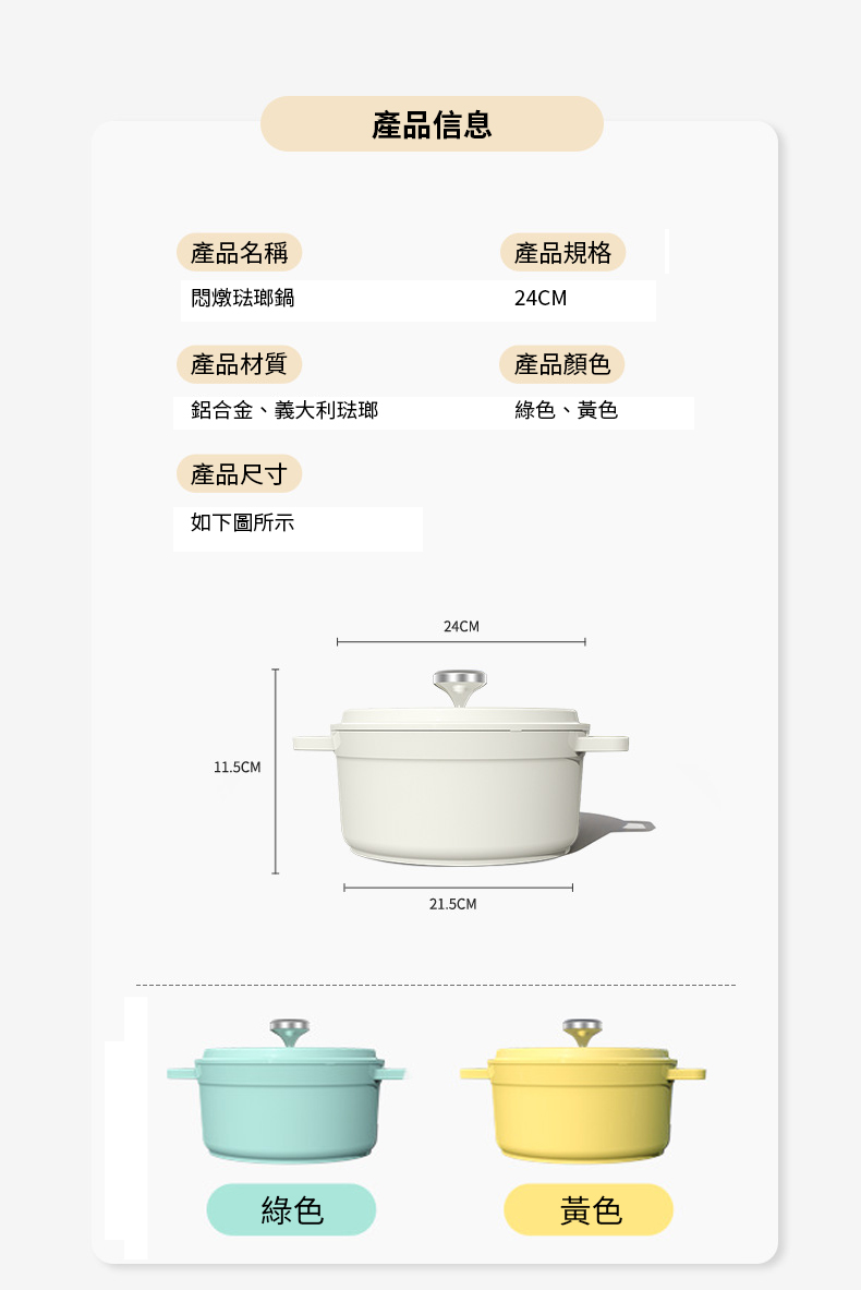 產品尺寸:直徑約24cm,鍋底直徑約21.5cm,高約11.5cm